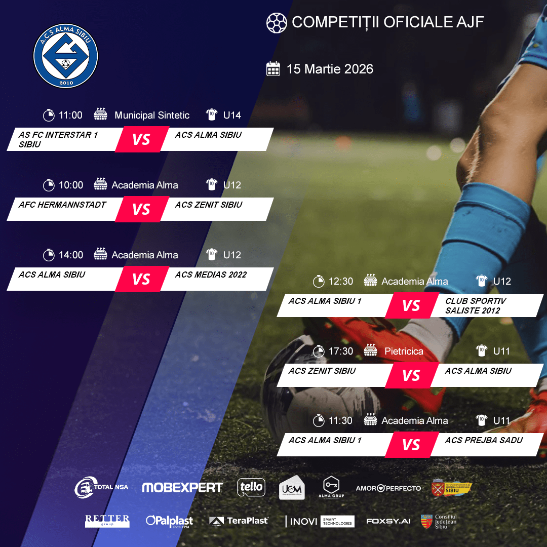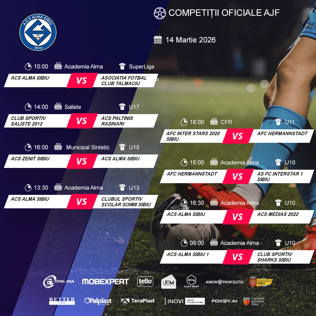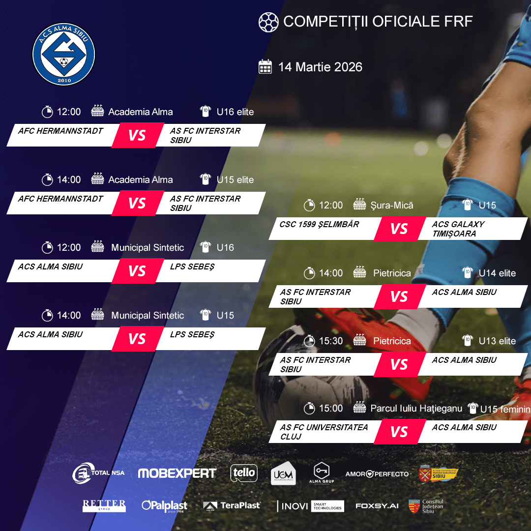 Prima pagină » Programul echipelor noastre în weekendul 14-15 Martie – competiții AJF și FRF! Programul echipelor noastre în weekendul 14-15 Martie – competiții AJF și FRF! Competitii Publicat in: 13 martie 2026