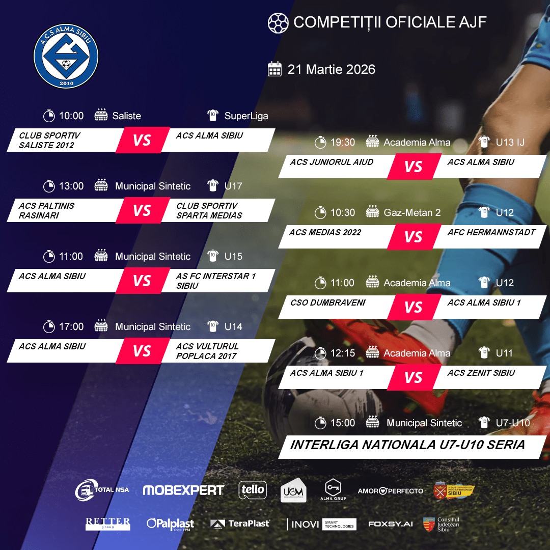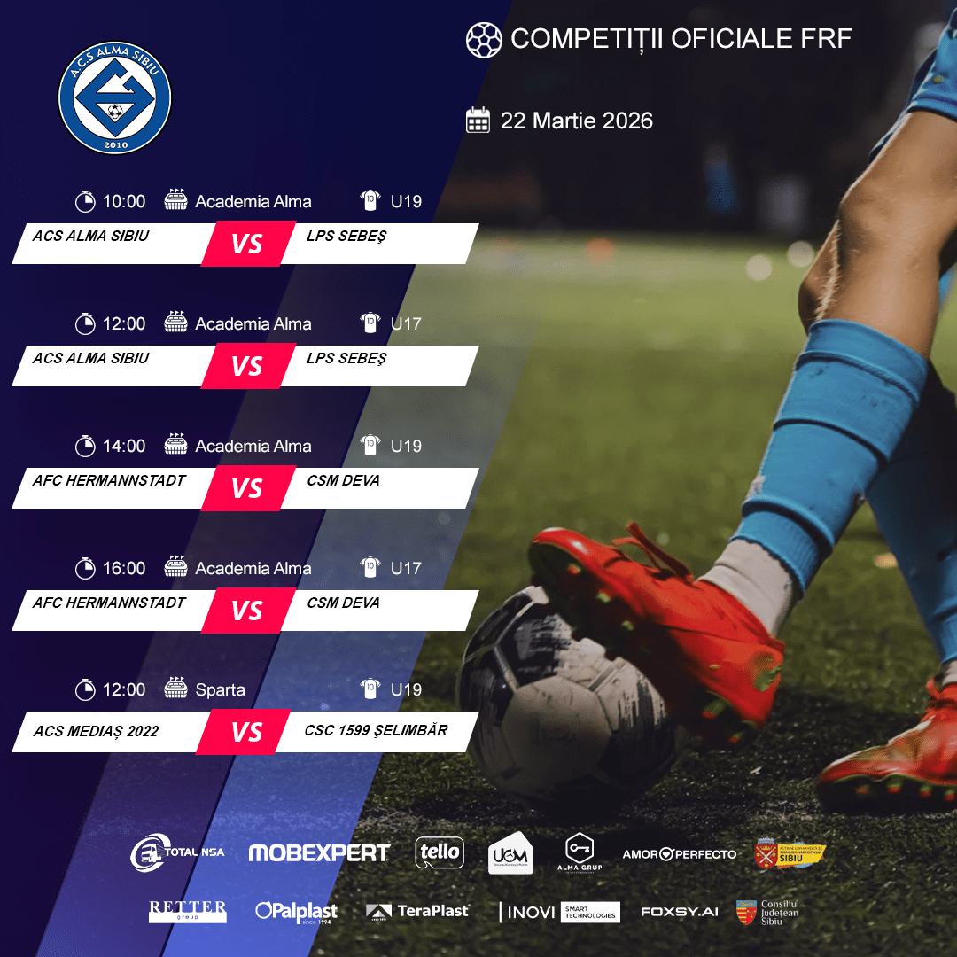 Prima pagină » Programul echipelor noastre în weekendul 21-22 Martie – competiții AJF și FRF! Programul echipelor noastre în weekendul 21-22 Martie – competiții AJF și FRF! Competitii Publicat in: 20 martie 2026