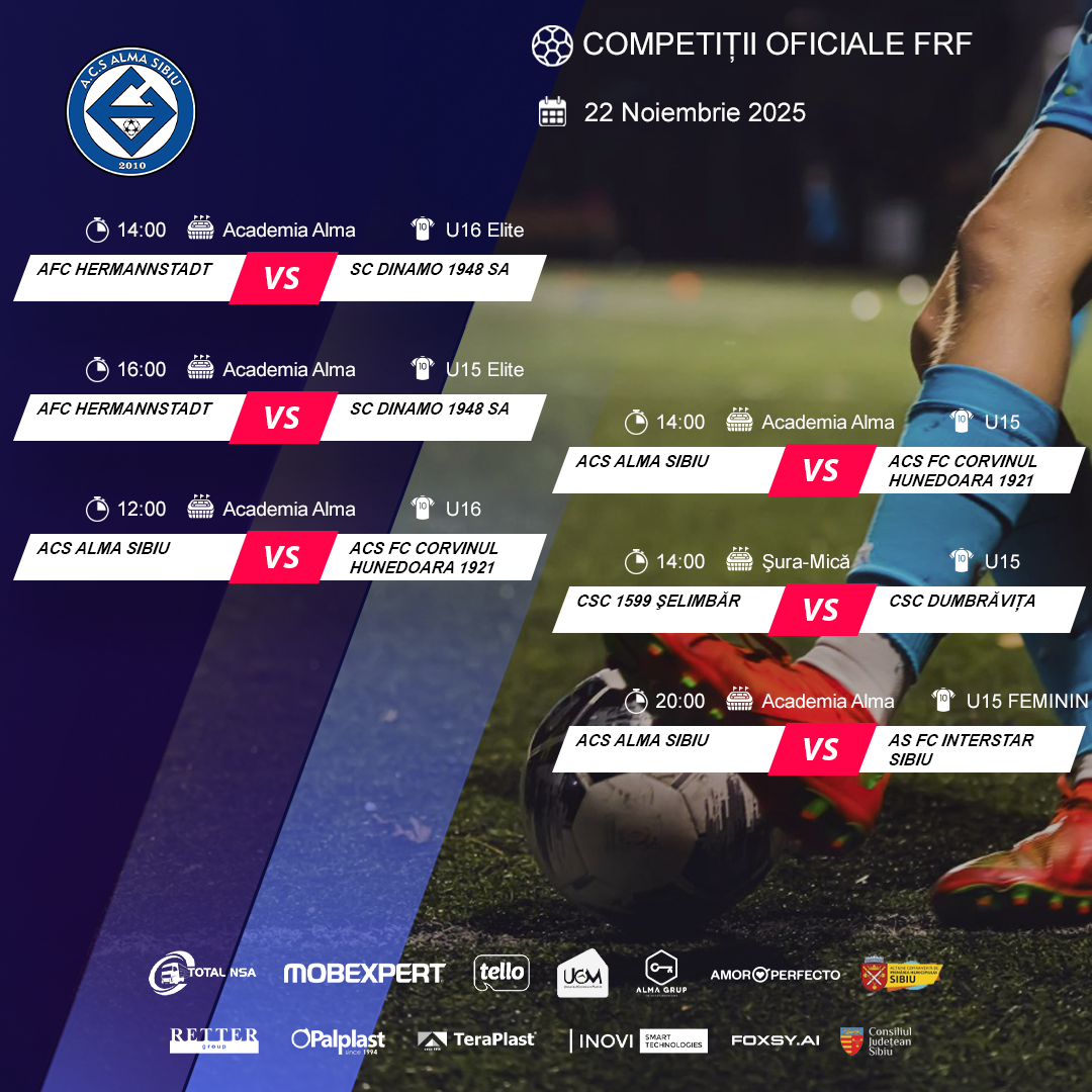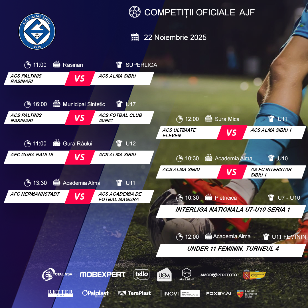 Prima pagină » Programul echipelor noastre în weekendul 22-23 NOIEMBRIE – competiții AJF și FRF! Programul echipelor noastre în weekendul 22-23 NOIEMBRIE – competiții AJF și FRF! Competitii Publicat in: 21 noiembrie 2025
